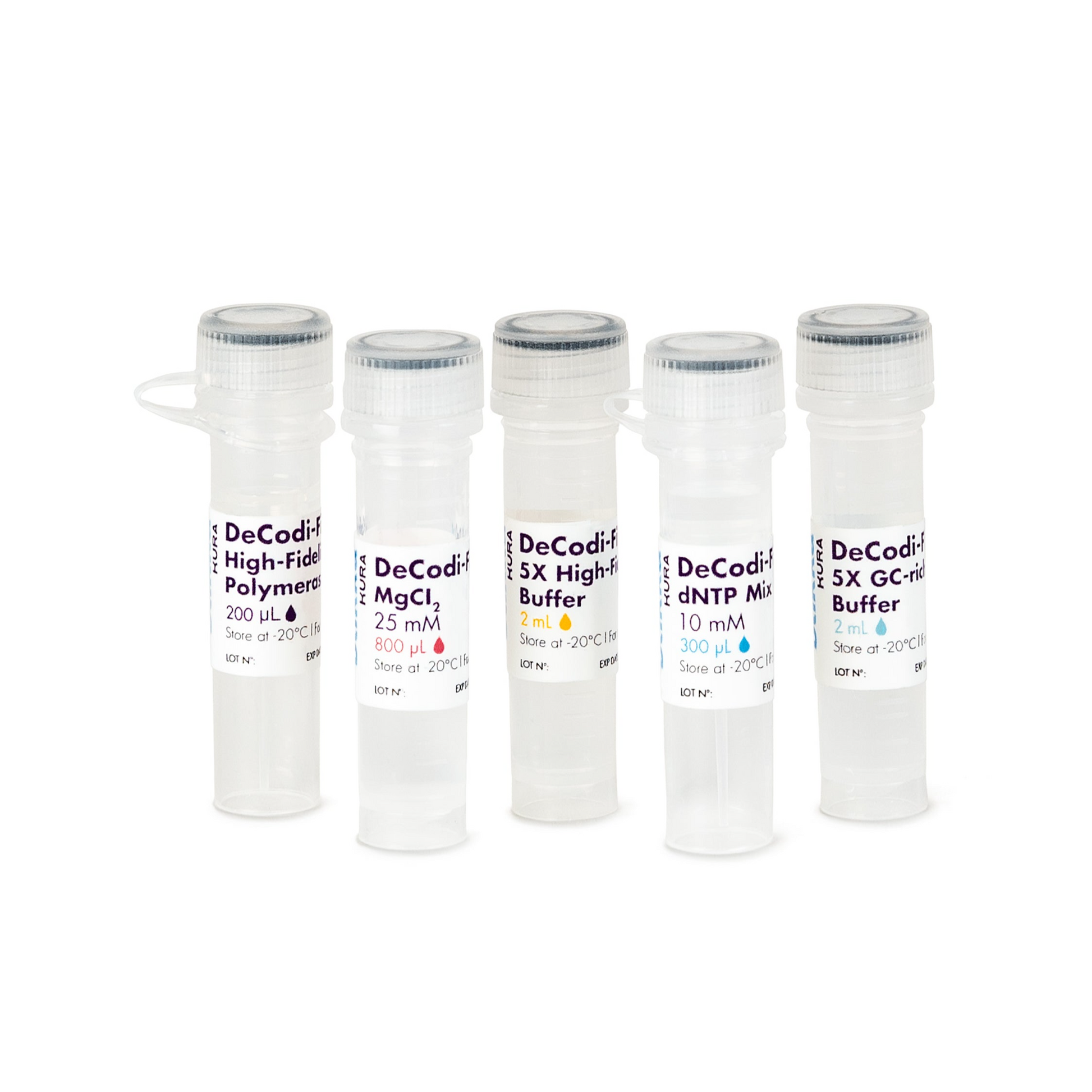 DeCodi-Fi High-Fidelity PCR Kit 400rxn format includes the Hotstart High-Fidelity Polymerase, two buffers (High-Fidelity Buffer and GC-rich Buffer), and all necessary components (dNTPs and MgCl2) separately (STORE AT -20°C)